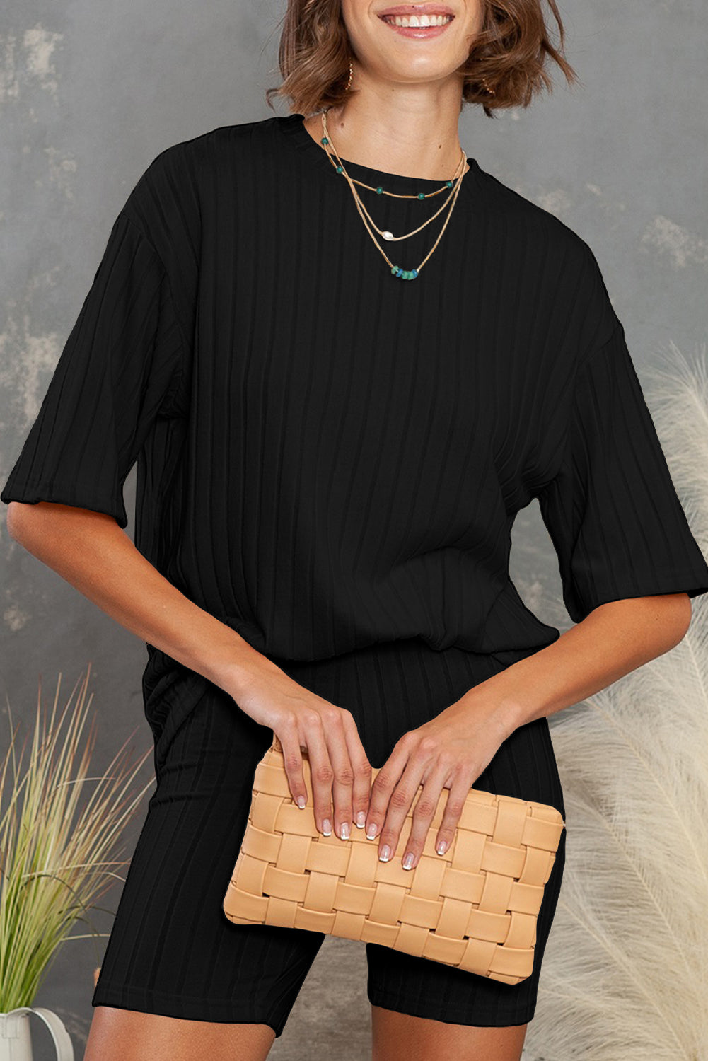 Gray Ribbed Knit Drop Shoulder T Shirt & Shorts Two Piece Shorts Sets